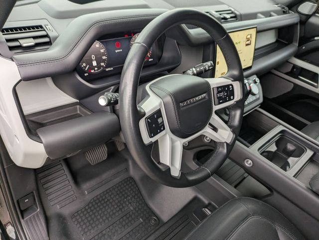 Indulge in the ultimate in comfort and convenience with the Defender's 12-way heated and cooled electric memory seats, dual-zone automatic climate control, and panoramic sunroof. The grained leather upholstery and premium interior finishes exude a refined and sophisticated ambiance.